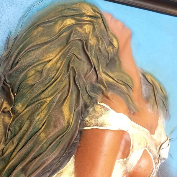 Uniek vintage leren schilderij in reliëf van een sexy dame uit de jaren 80.