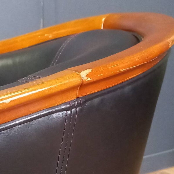 Gemaakt van kwaliteit rundleder en afgewerkt met een kersenhouten band over de rug doorlopend naar de armsteunen die mooi contrasteren met het donkerblauwe leer.