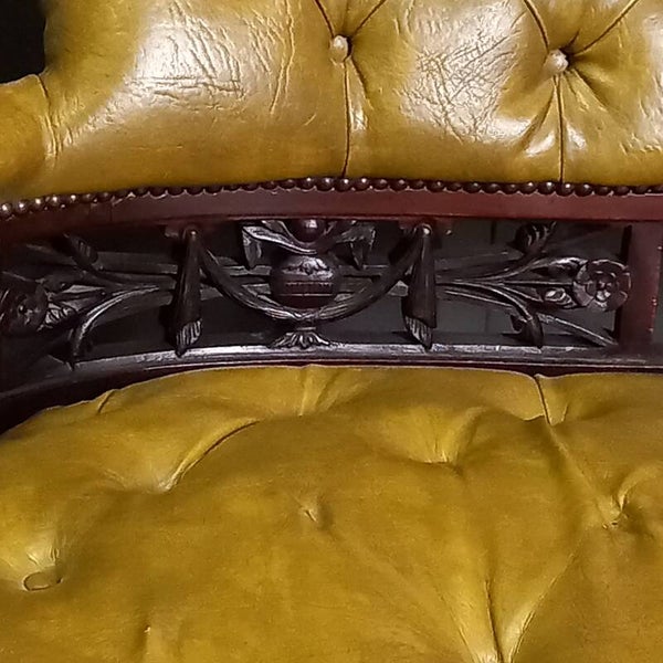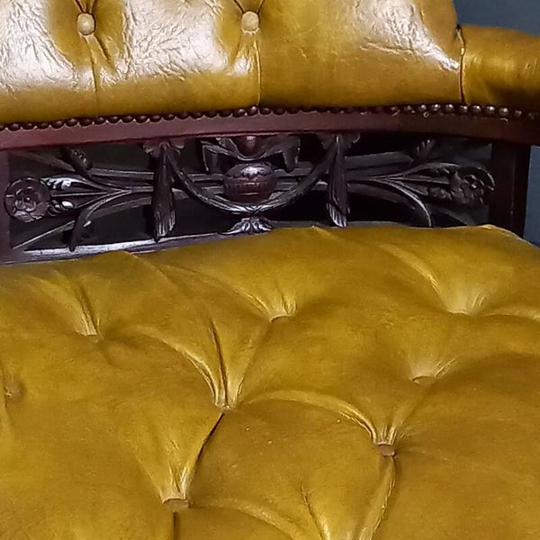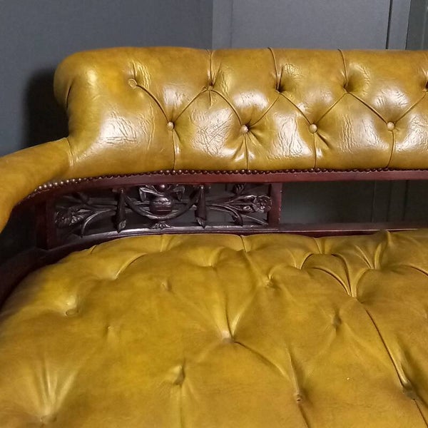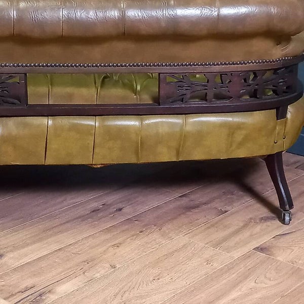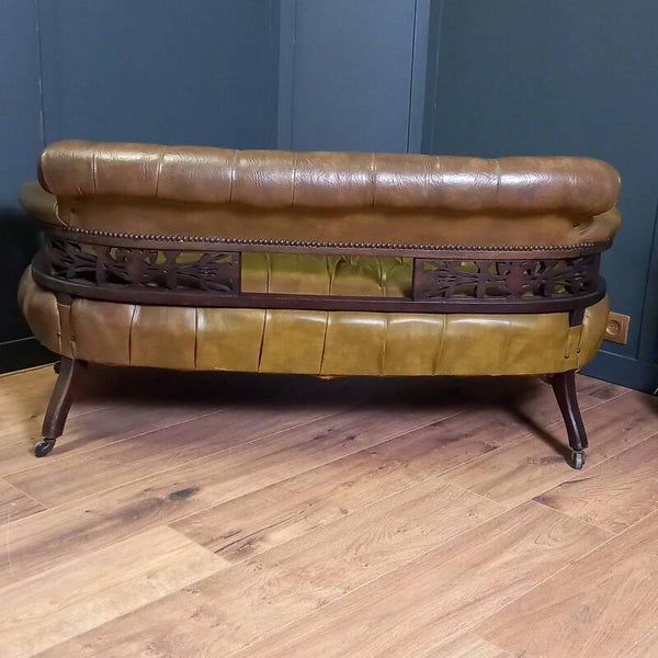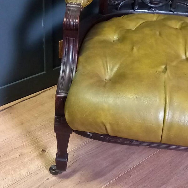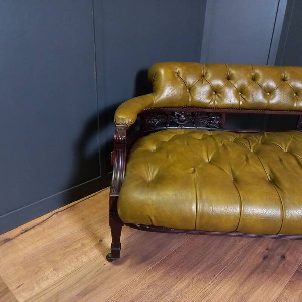Charmant groen leren Victoriaans Chesterfield leesbankje uit Engeland