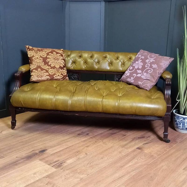 Dit prachtige antieke bankje dateert uit de late 19e of het begin van de 20e eeuw. Het zitmeubel heeft een gecapitonneerde zitting en rugleuning en verkeert nog in zeer goede staat. Het levendige groene leer geeft het bankje een opvallende uitstraling die elke ruimte kan verfraaien.