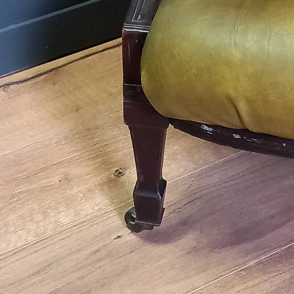 Er ontbreken een tiental knopen uit de zitting. Om kleurverschillen te voorkomen, is dit opzettelijk zo gelaten. De originele messing wieltjes zijn vervangen door kunststof wieltjes, wat de functionaliteit van het meubel ten goede komt zonder afbreuk te doen aan de esthetiek.