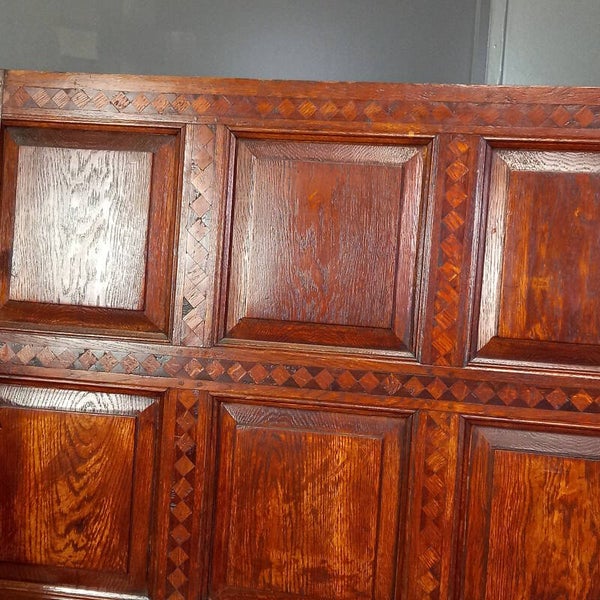 Ontdek deze schitterende antieke hal-bank, een ware aanwinst voor de liefhebber van historisch vakmanschap! Deze massief eikenhouten bank uit de 18e eeuw, afkomstig uit Dorchester, straalt tijdloze elegance uit en is rijk versierd met prachtige marqueterie en parqueterie van noten en eikenhout in zowel de panelenrug, zitting als armleuningen.