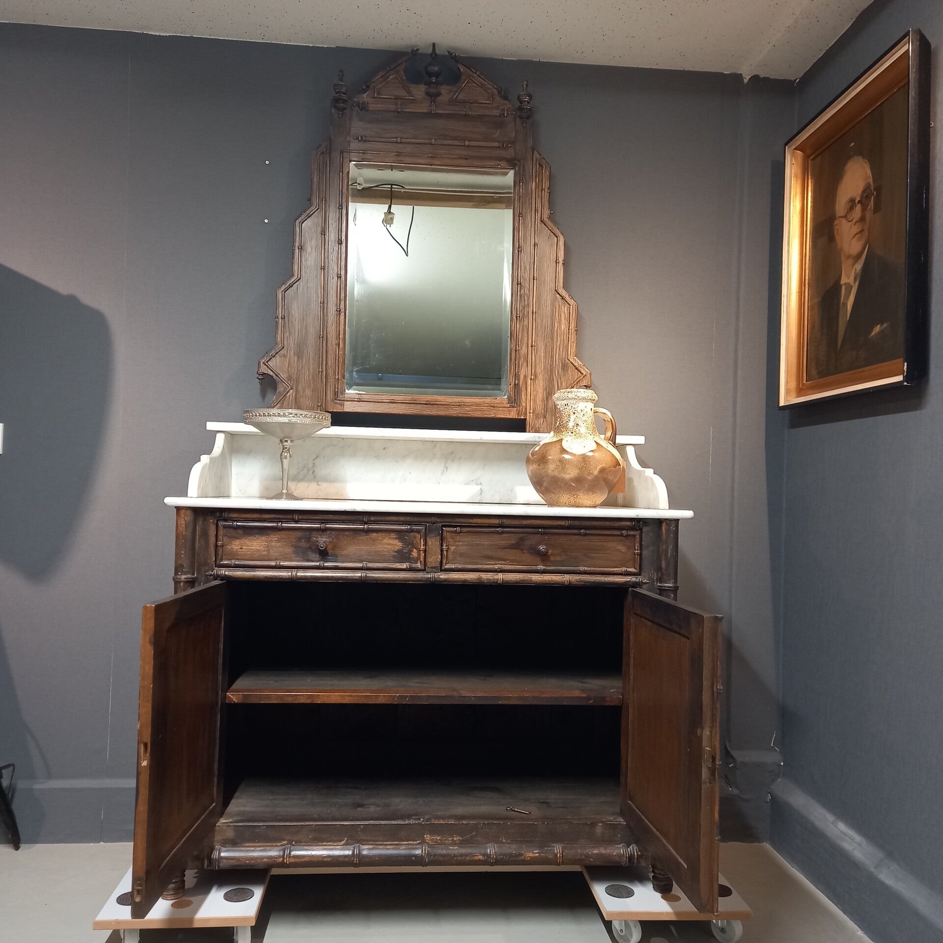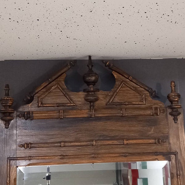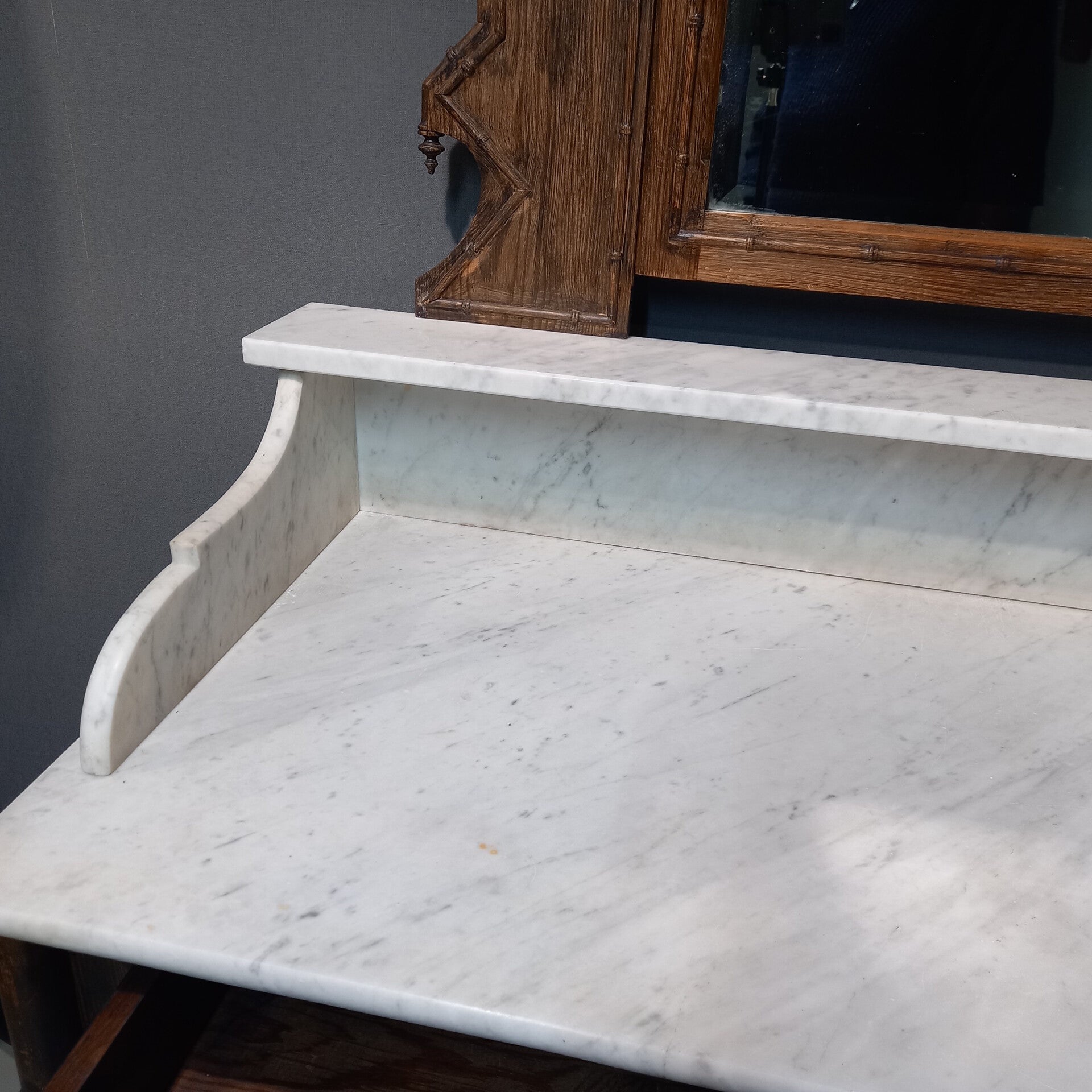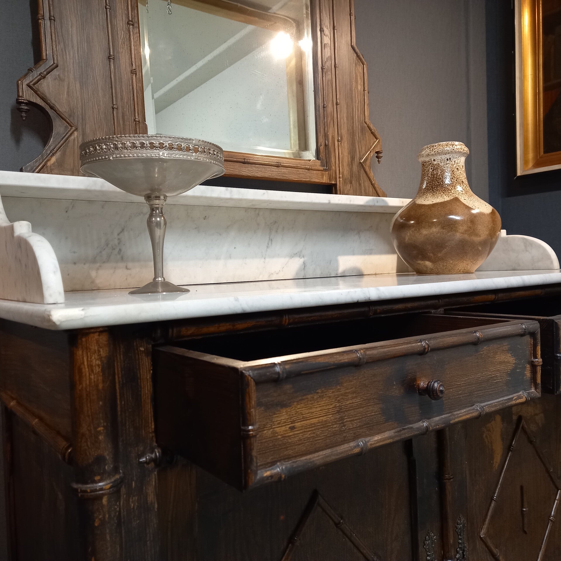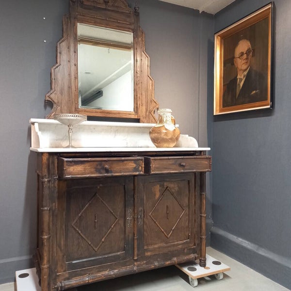 Antiek dressoir met marmeren blad, opstand en spiegel – Faux Bamboo (Frankrijk, ca. 1910–1930)