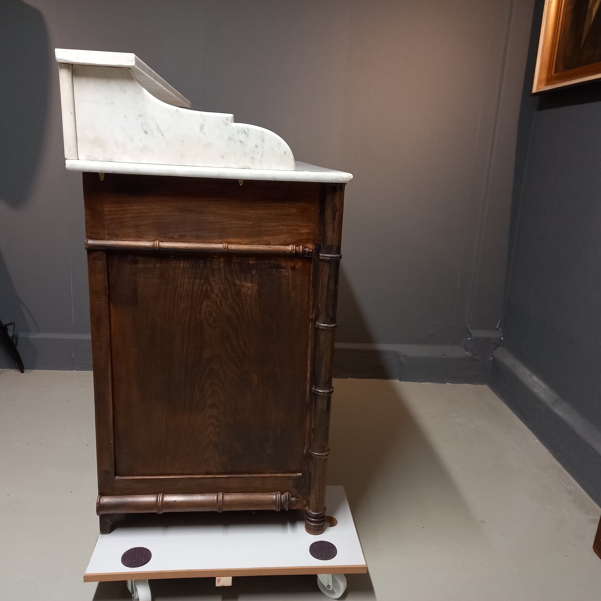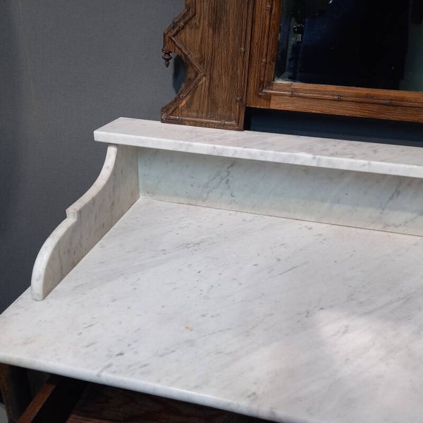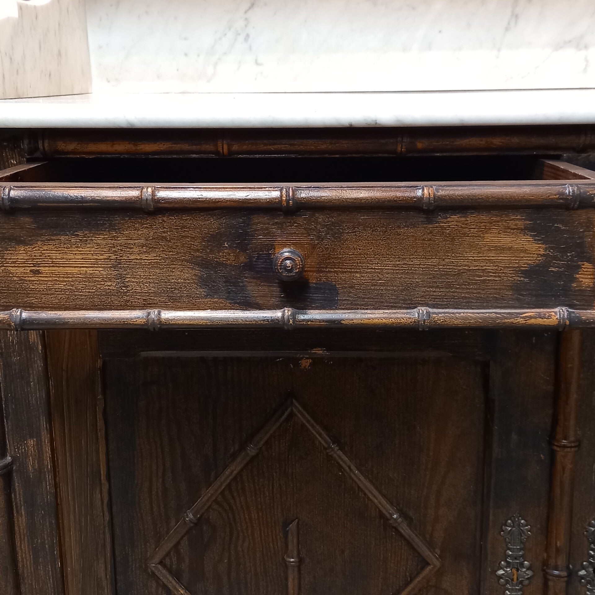 Dit elegante antieke dressoir met marmeren blad en opstand is uitgevoerd in de geliefde Faux Bamboo stijl, ook wel nepbamboe genoemd. Rond 1900 was deze stijl enorm populair dankzij de exotische bamboe-uitstraling, die destijds zeldzaam was in Europa en werd gezien als een luxe oosters accent in het interieur.