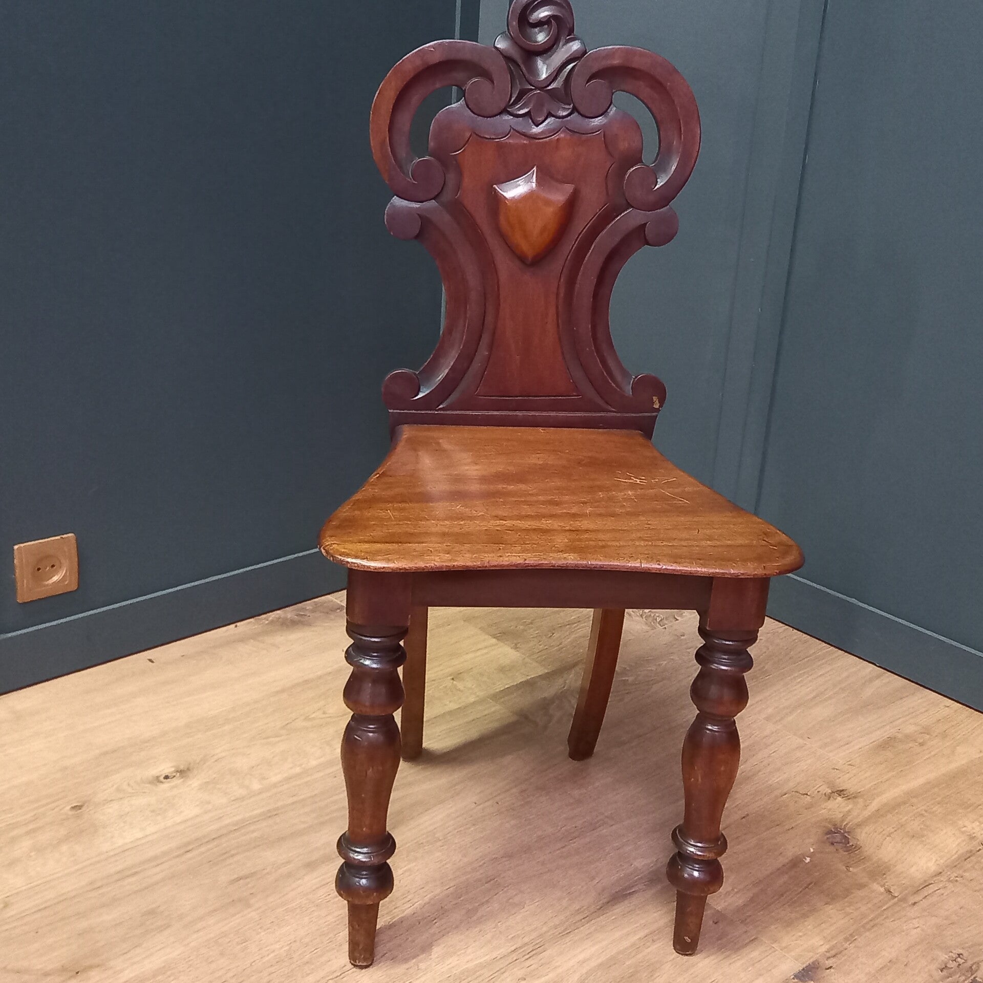 Deze schitterende antieke Engelse halstoel uit de George IV periode, vervaardigd rond 1825–1830, is een verfijnd voorbeeld van authentiek vakmanschap in massief notenhout. De stoel valt direct op door de karakteristieke schildvormige rugleuning met een subtiel afgeronde bovenrand en een opengewerkt rugpaneel, rijk gedecoreerd met een wapenschild in reliëf. Dit unieke detail geeft de stoel een statige en tijdloze uitstraling die perfect past binnen een klassiek, landelijk of eclectisch interieur.