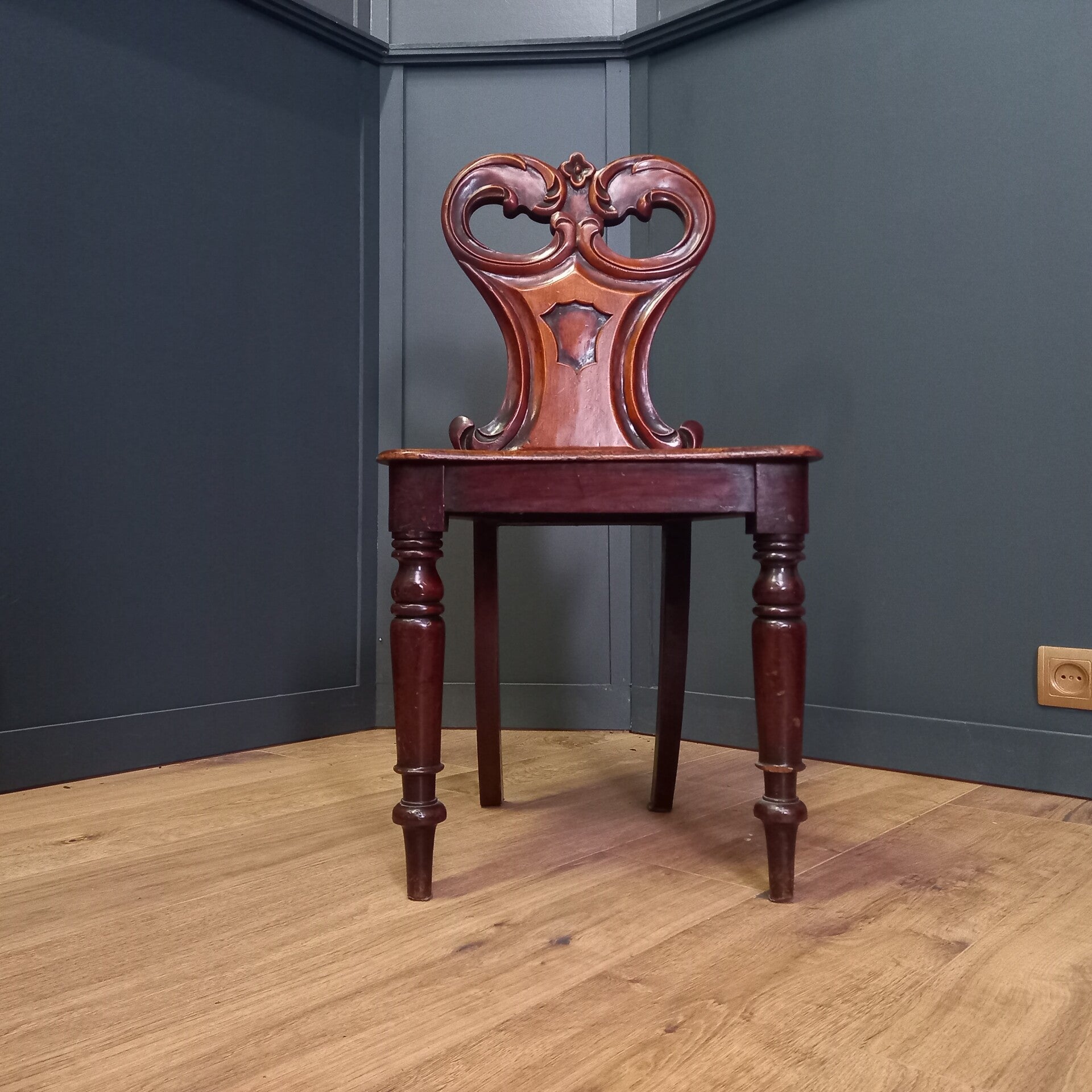Het gevormde zitvlak, met een comfortabele zithoogte van circa 41 cm, maakt deze antieke ontvangststoel niet alleen decoratief maar ook functioneel in gebruik. De sierlijk gedraaide balusterpoten aan de voorzijde en de licht uitlopende sabelpoten aan de achterzijde geven de stoel zijn verfijnde silhouet en benadrukken het klassieke Engelse design. De warme kleur en rijke patina van het notenhout versterken het exclusieve karakter van dit bijzondere meubelstuk.